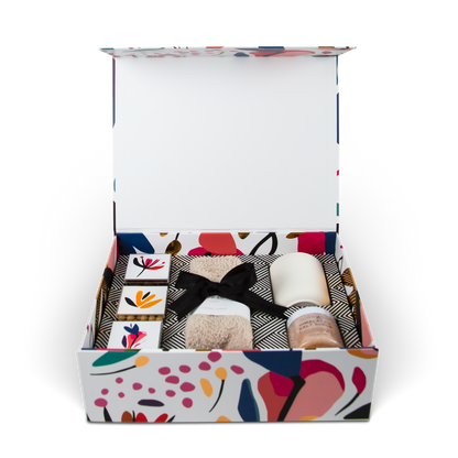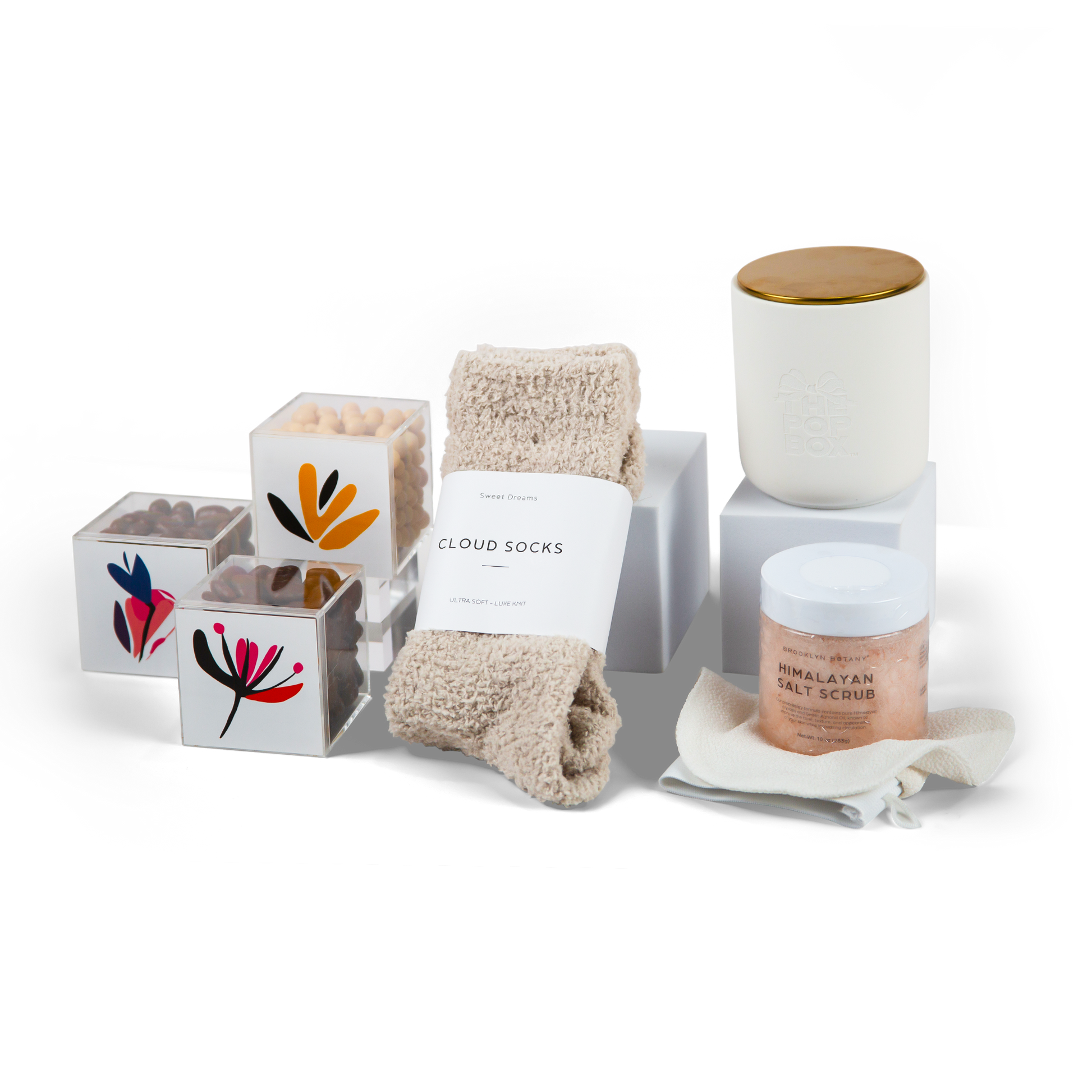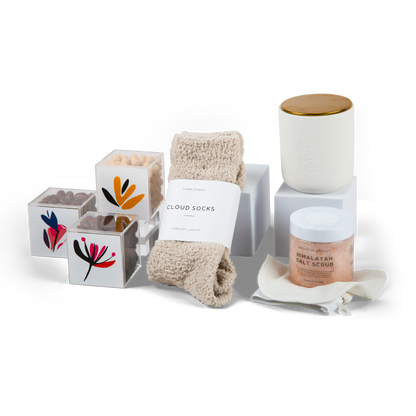 Inside, she’ll find a luxury scented candle to soften the edges of her day. Plush, cozy socks to envelop her in warmth. Three gourmet dairy chocolates, each elegant and indulgent in its own right. A smoothing, restorative body scrub with an exfoliating glove — a gentle invitation to care for herself as deeply as she cares for others.